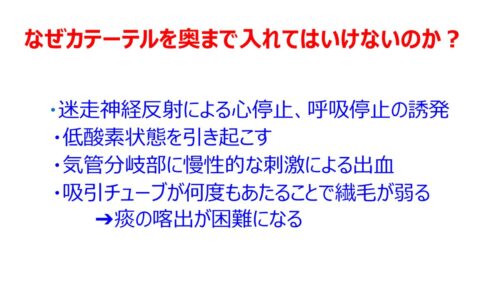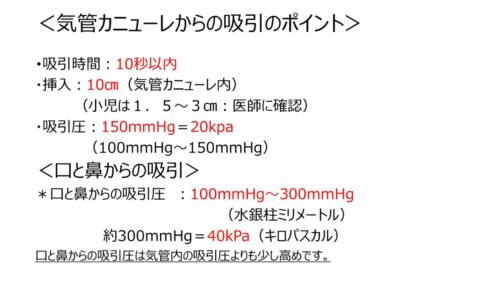 吸引の間は無呼吸状態となることや気道内の空気も吸引していることから吸引時間が長いと低酸素症を起こす可能性があので注意が必要です。