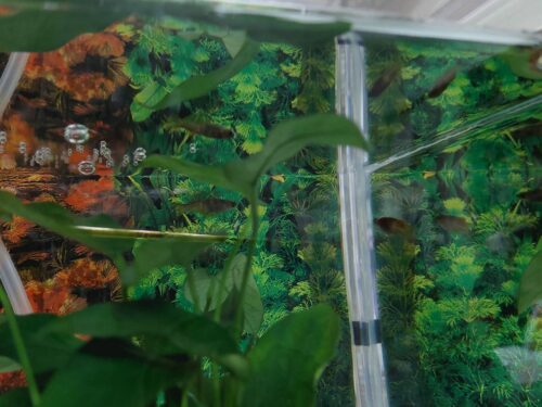 こちらの写真では、水槽に群がるメダカたちのびのびと泳ぐ姿や、自然な環境を再現した水草がきれいに育てている様子もご覧いただけます。
