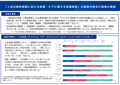 調査の主な結果の 1 つは、日本国民の間でアドバンス・ケア・プランニング (ACP) の認知度が少しずつ高まっているという点です。