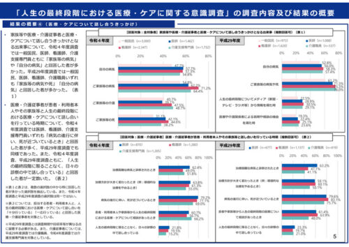 厚生労働省が実施した2022年の「人生の終末期における医療・療養に関する調査」は、人々が人生の終末期の医療をどのように認識しているかについての貴重な洞察を提供し、終末期の決定に関する世論の現状を垣間見ることができます。