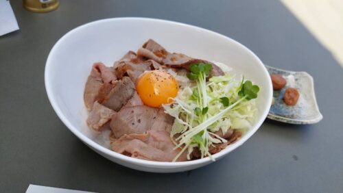 喫茶四季庭で注文したローストビーフ丼は、しっとりとしたお肉が口の中でとろけるような柔らかさで、山葵がアクセントとなり絶妙の美味しさに。