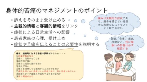 がん疼痛の評価とマネジメントは、“主観的な訴え”と“客観的な観察”の両方をバランスよく捉えることが大切です。