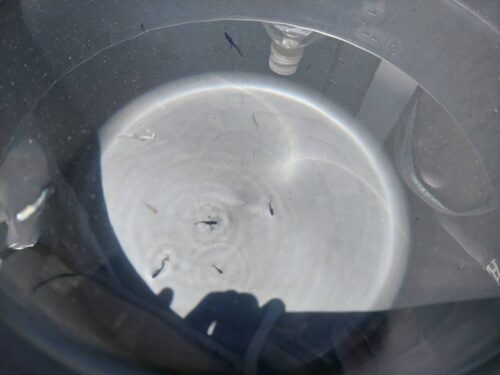 孵化して間もない頃は頼りなげだった小さな命も、いまではしっかりと泳ぎ回り、光に反射してキラキラと輝いて見えます。