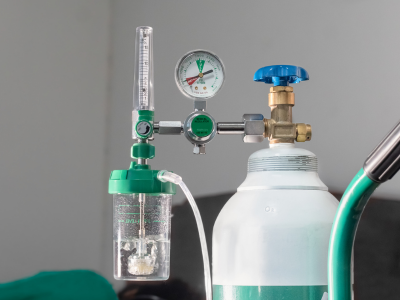 500Lの酸素ボンベ(14.7MPa充填)の内圧が10MPaを示している。この酸素ボンベを用いて3L/分で酸素吸入を行う。