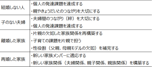 子どもを持たない夫婦や再婚家庭など、家族の形態に応じた発達課題が存在することも重要です。
