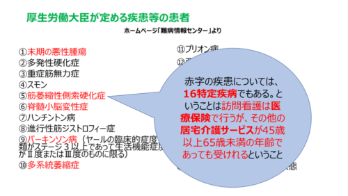 ・厚生厚生労働大臣の定める疾病等については主治医の特別訪問看護指示書により、医療保険で週4日以上、訪問看護サービスを受けることができる。