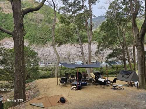 また、桜の木の下で食べるキャンプ飯は格別なものです。