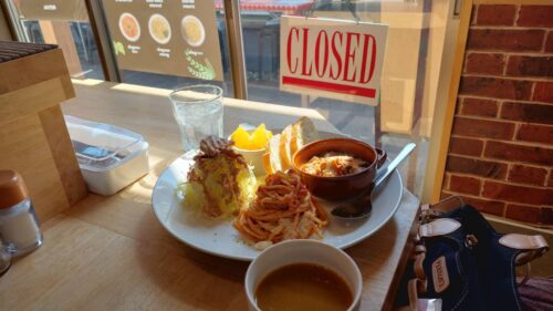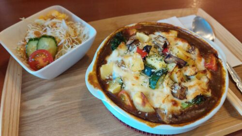 オーブンでこんがり焼かれたカレーは、表面のチーズがとろっと溶けて香ばしい香りが漂います。