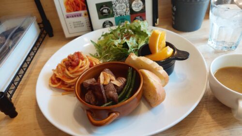 しっかりと食べ応えのあるサイコロステーキともっちり麺のスパゲッティ。