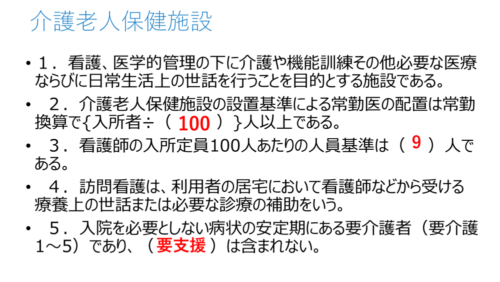| 老健(介護老人保健施設) | 医師 常勤1名以上 | 在宅復帰支援 |